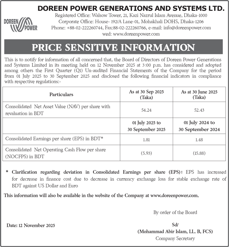 Price Sensitive Information of Doreen Power Generations and Systems Limited