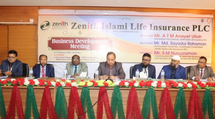 অদ্য ০৭ ফেব্রুয়ারী ২০২৬ শনিবার দিনব্যাপী রাজধানীর পল্টন টাওয়ারের ইআরএফ অডিটোরিয়ামে জেনিথ ইসলামী লাইফ ইন্স্যুরেন্স পিএলসির ব্যবসা উন্নয়ন সভা অনুষ্ঠিত হয়েছে। উক্ত সভায় প্রধান অতিথি হিসেবে উপস্থিত ছিলেন কোম্পানির ভাইস