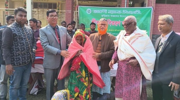 কুড়িগ্রাম জেলার ফুলবাড়ী উপজেলার ধরলা নদী তীরবর্তী পশ্চিম ধনিরাম এলাকায় শীতার্ত ও অসহায় মানুষের মধ্যে কম্বল বিতরণ করেছে অগ্রণী ব্যাংক পিএলসি, কুড়িগ্রাম অঞ্চল। রোববার (১৮ জানুয়ারি) দুপুরে অগ্রণী ব্যাংকের পরিচালক